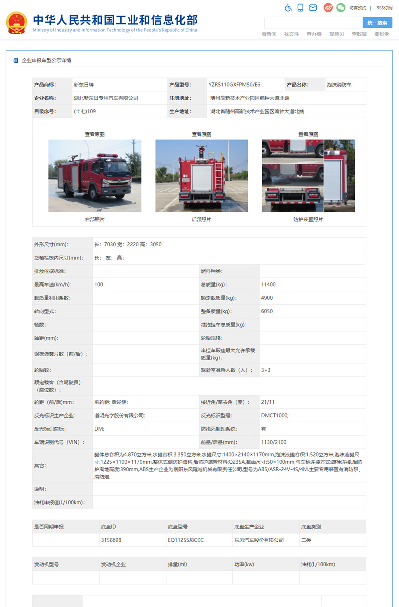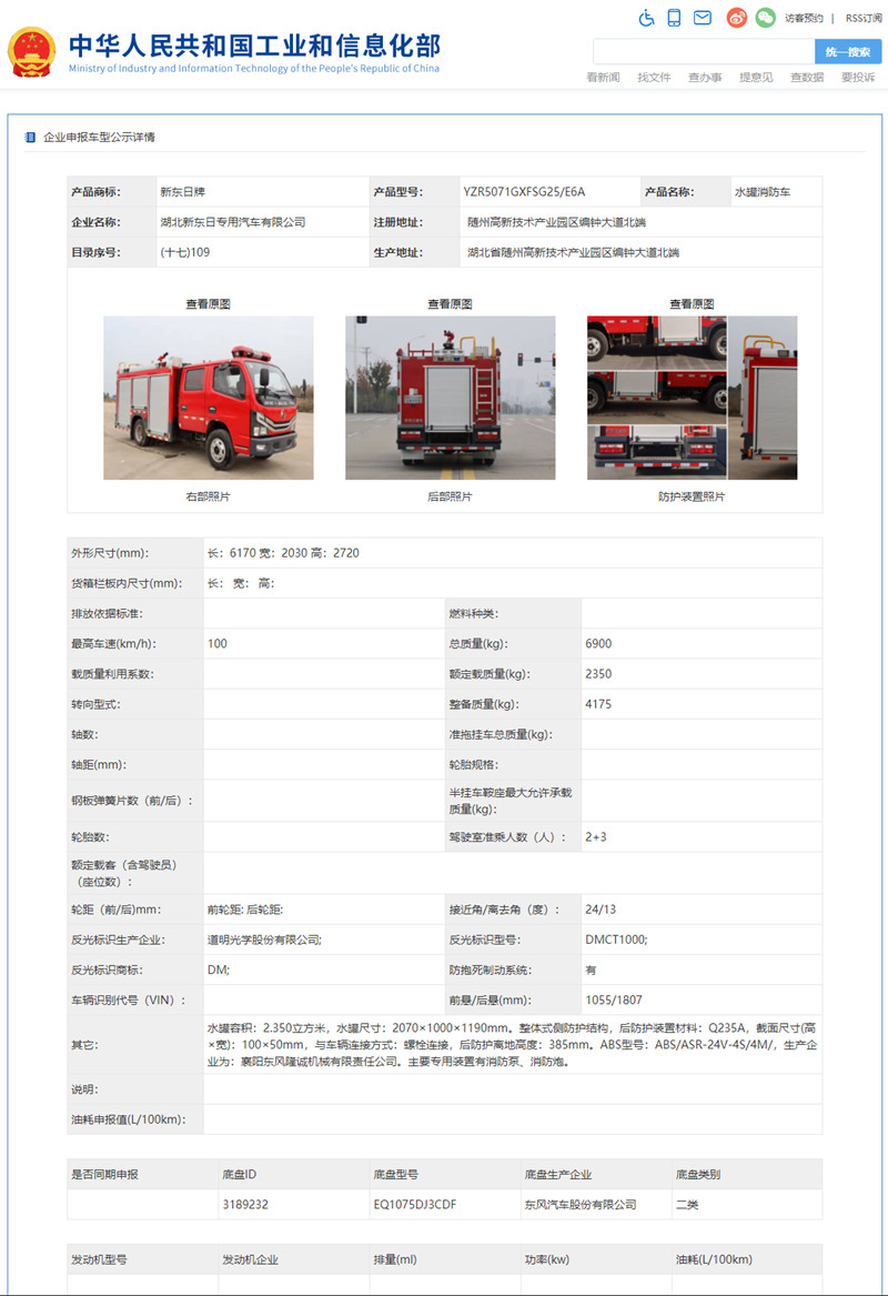 根據(jù)《道路機(jī)動車輛生產(chǎn)企業(yè)及產(chǎn)品公告》管理和《財政部 稅務(wù)總局 工業(yè)和信息化部 交通運(yùn)輸部關(guān)于節(jié)能 新能源車船享受車船稅優(yōu)惠政策的通知》(財稅〔2018〕74號)的有關(guān)要求應用的因素之一,現(xiàn)將《道路機(jī)動車輛生產(chǎn)企業(yè)及產(chǎn)品公告》(第343批)中可以看到,我公司有兩款消防車公告公示技術特點,東風(fēng)2.5噸水罐消防車和東風(fēng)5噸泡沫消防車提高鍛煉。