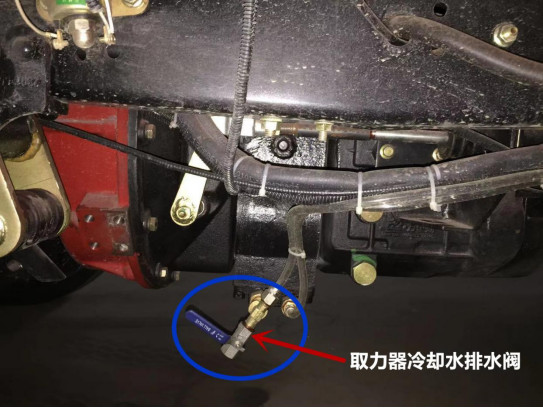打開取力器冷卻水排水閥,該閥門在駕駛室下方積極。