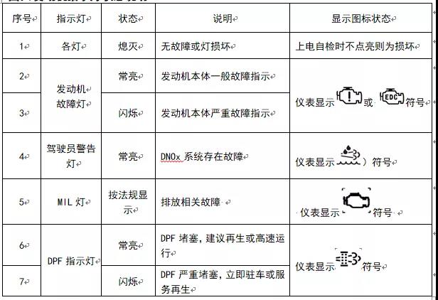 國六發(fā)動機(jī)指示燈狀態(tài)說明: