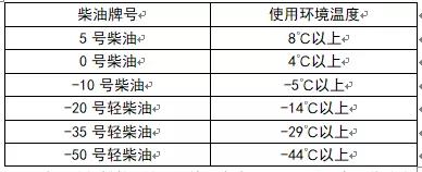 為了使發(fā)動機(jī)擁有更高的可靠性和更好的經(jīng)濟(jì)型意見征詢,柴油應(yīng)選用符合19147-2018國六標(biāo)準(zhǔn)的正規(guī)柴油,并隨著地區(qū)環(huán)境氣溫的不同而選用不同牌號的清潔柴油大大提高。根據(jù)使用環(huán)境氣溫的必然要求,按下表選用不同牌號的清潔柴油: